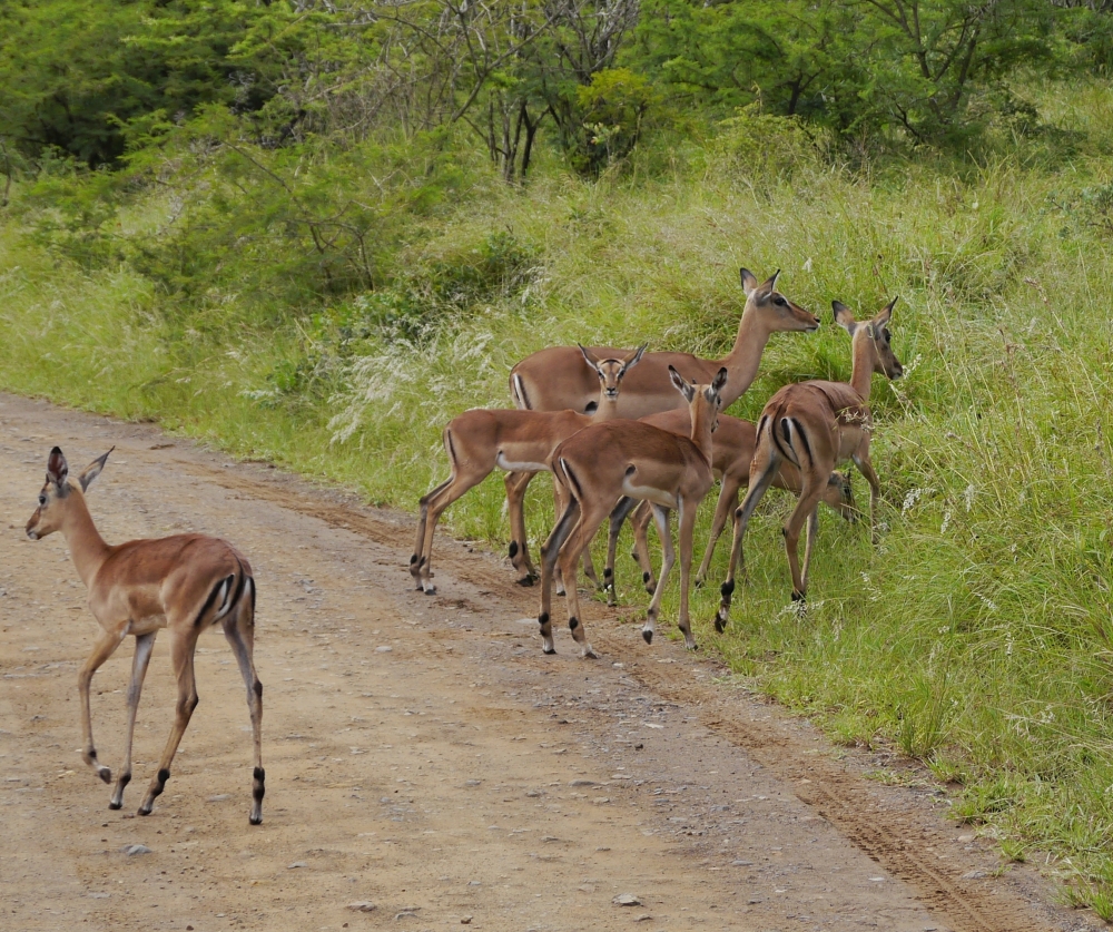 Am nächsten Tag besuchten wir den Hluhluwe-Nationalpark. Wir wurden 5 Uhr morgens mit Jeeps vom Hotel abgeholt. Nach einer Stunde Fahrt erreichten wir den Nationalpark und das Abenteuer konnte beginnen. Wir waren sehr gespannt, welche Tiere wir sehen würden, denn in der Regenzeit wuchert das Grün und man hat weniger Sicht auf die Tiere.