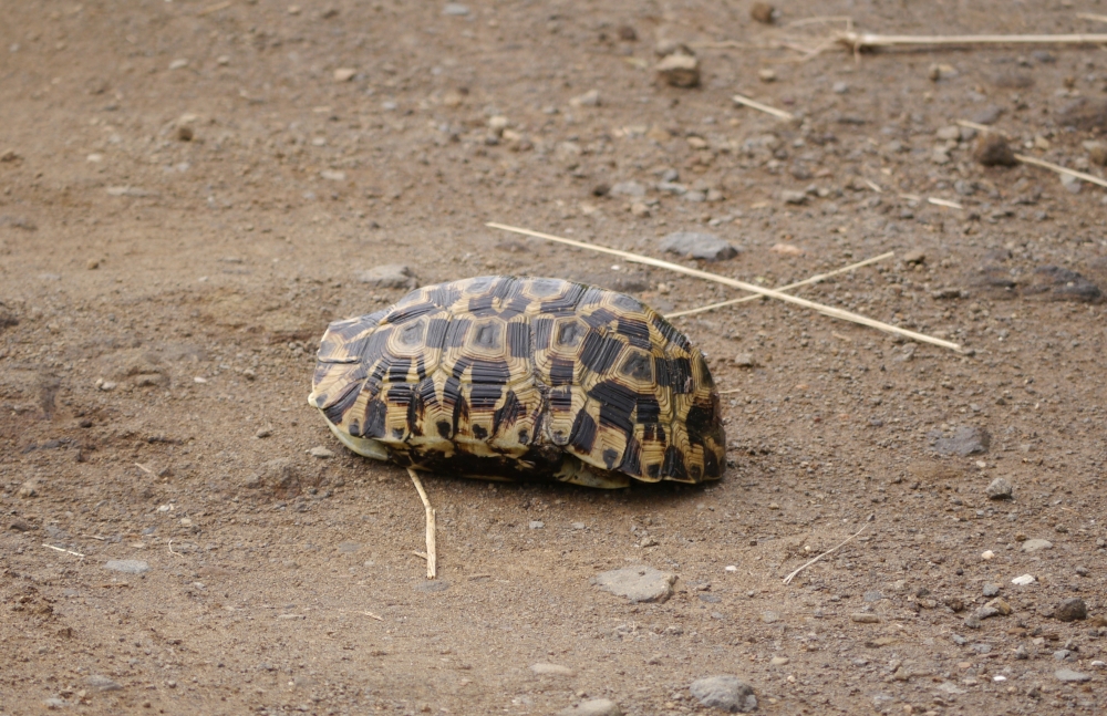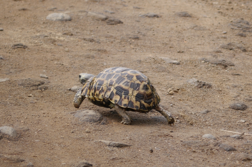 Eine Schildkröte erschrak sich über unser Auto. Als wir anhielten, eilte sie dann „rasch“ weiter.