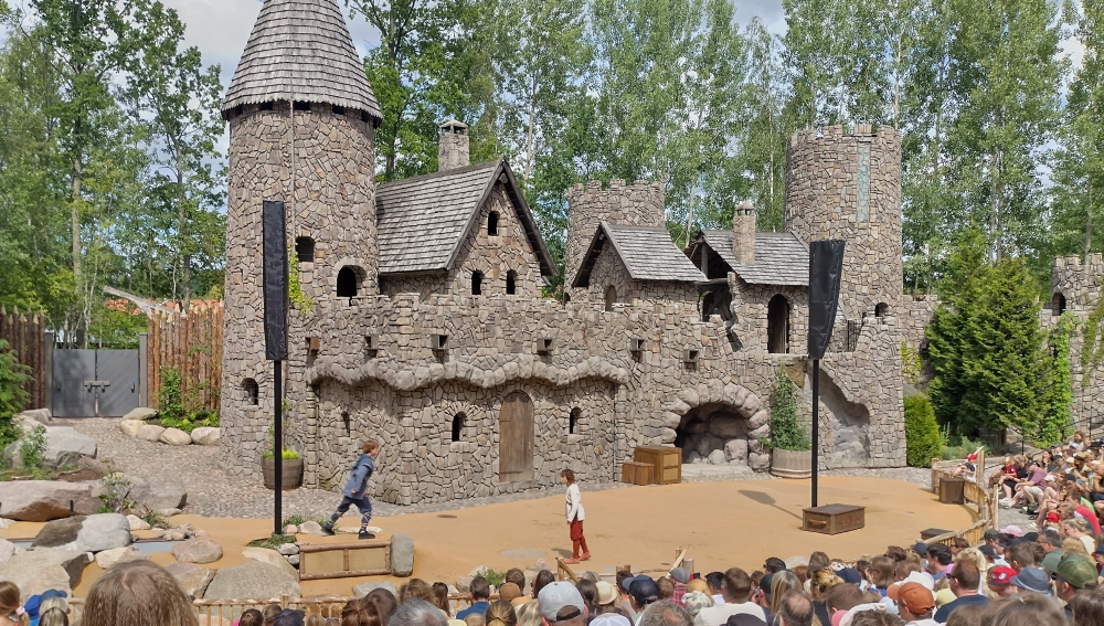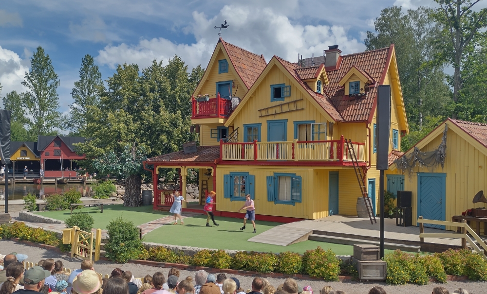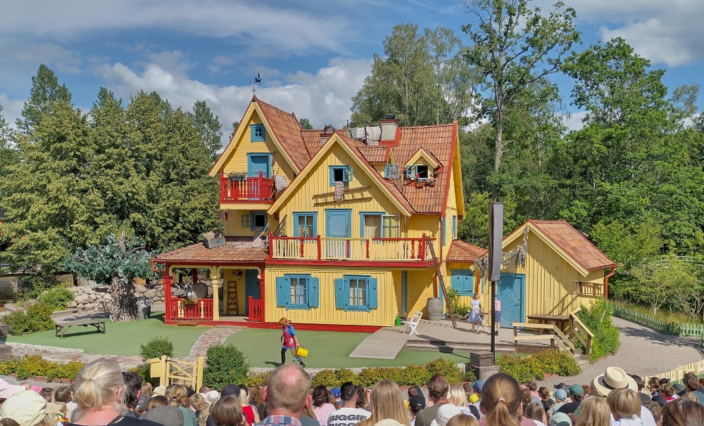 Heute haben wir den Themenpark besucht, der ganz der Fantasiewelt von Astrid Lindgren gewidmet ist. Es gibt insgesamt 8 Bühnen, auf denen mehrmals am Tag Stücke aufgeführt werden, u.a. von Pippi Langstrumpf, Michel aus Lönneberga, Ronja Räubertochter und Mio Mio. Es gibt kleine Häuser (im Maßstab 1:3) für die Kinder, diverse Geschäfte, Gaststätten, Spielplätze usw. Da in Schweden derzeit Ferien sind, war es rappelvoll, und man hörte auch viele deutsche und englische Worte.