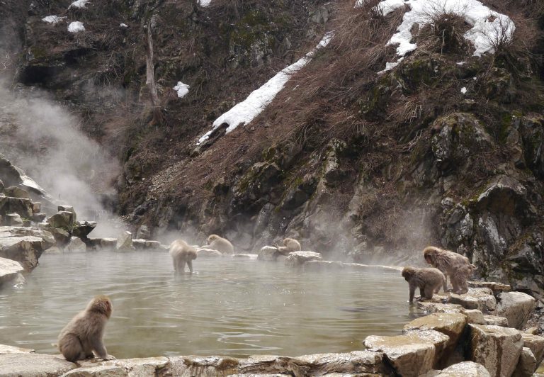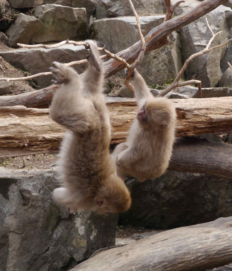 Unser gestriger Tag führte uns mitten in die Berge, wo noch Schnee lag und einige Skipisten noch in Betrieb waren. Am Vormittag besuchten wir den sogenannten Affen-Pool. Dort baden die japanischen Makaken in einem von Menschenhand angelegten Pool, der von einer heißen Quelle gespeist wird. Das ist eine Touristenattraktion und die Affen lassen sich durch die Menschen nicht weiter stören.