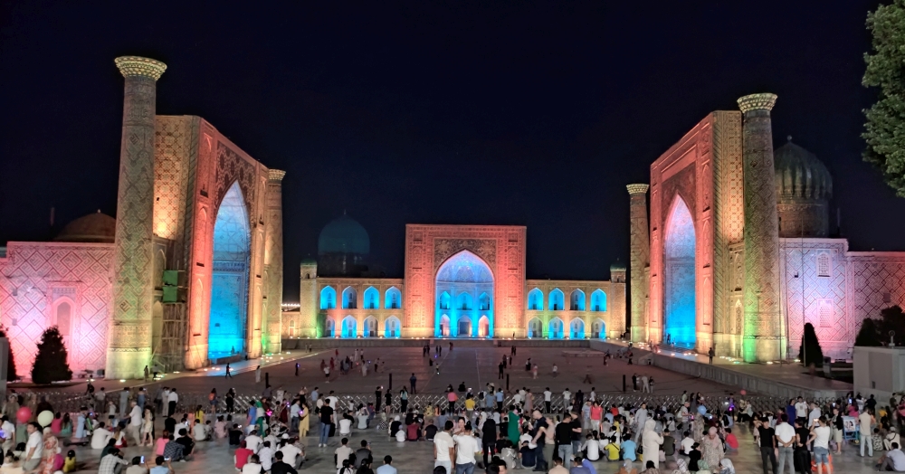 Nach einer anstrengenden Fahrt mit PKW’s (teilweise mit sehr schwacher Klimaanlage) gab es nach dem Abendessen nochmal eine Stippvisite am Registan – immer wieder schön.