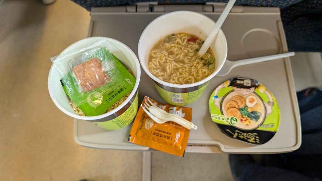 In jedem Waggon gibt es heißes Wasser und so bringt man sich eine Instant-Suppe mit und hat ein Mittagessen.