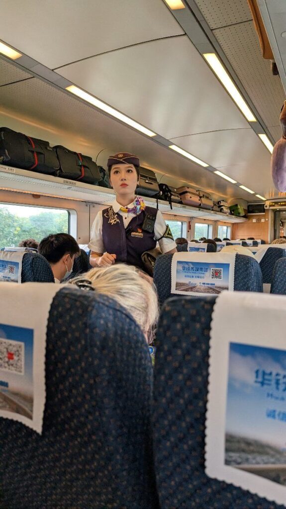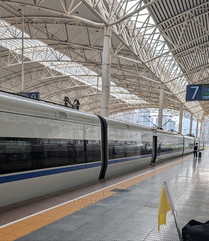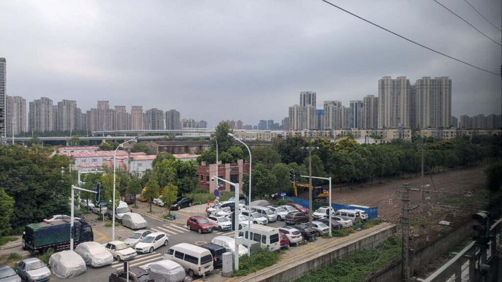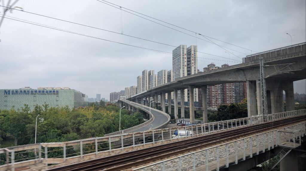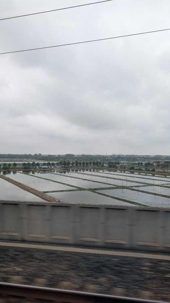 Wir waren etwa 6,5 Stunden unterwegs für 1.200km. Unter den Zwischenstopps waren auch die großen Städte Nanjing und Wuhan (wer kennt es nicht?). Man fährt durch Reisfelder, Gebirge und immer wieder an Städten mit Hochhäusern vorbei.