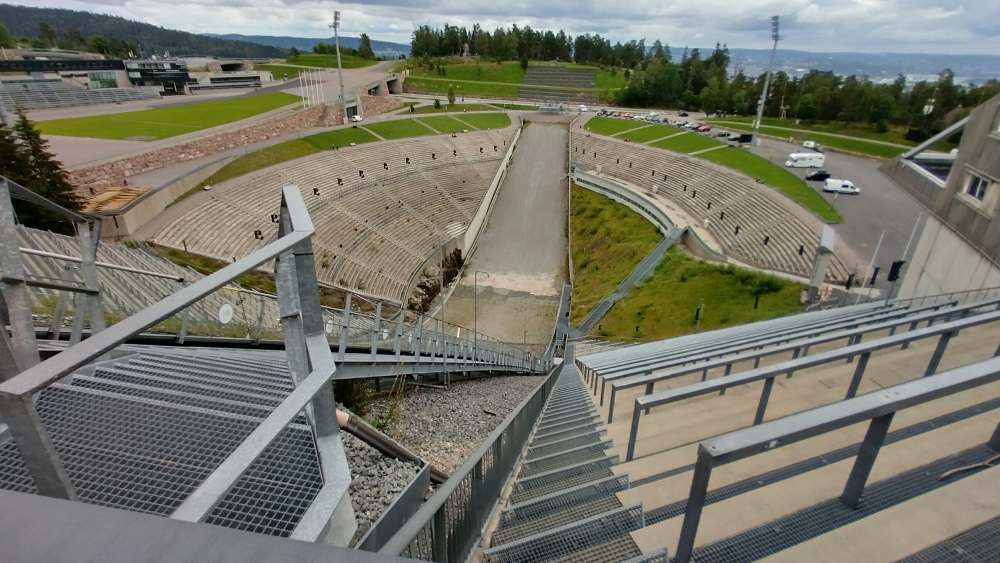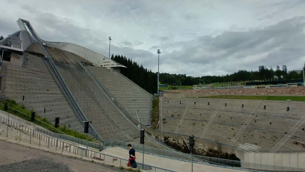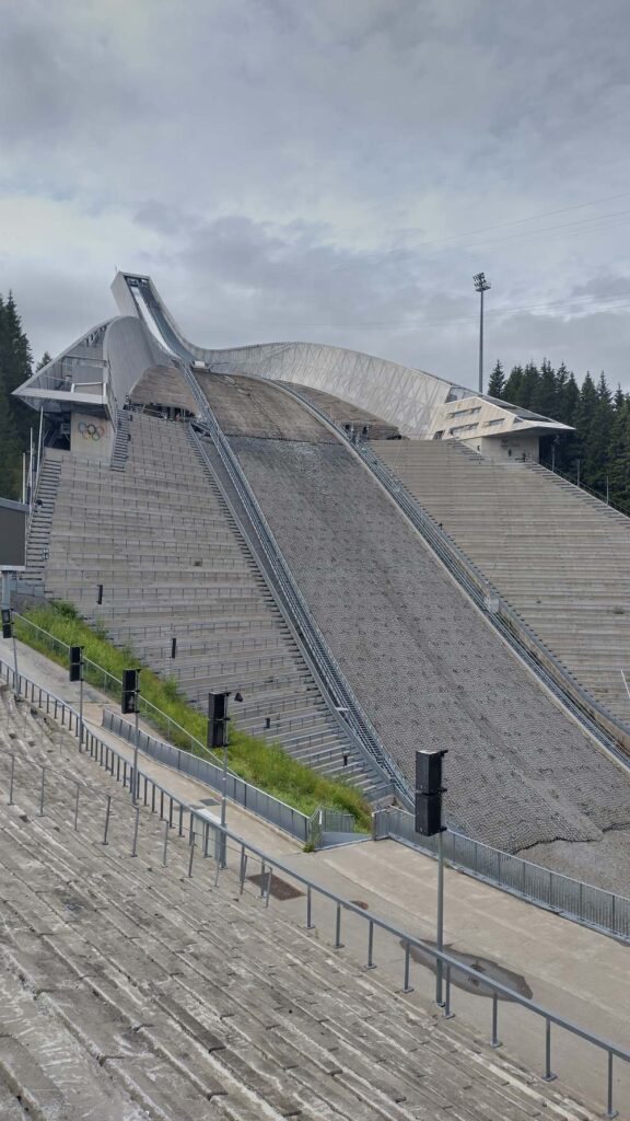 Am Nachmittag haben wir eine andere Norwegische Legende besucht – den Holmenkollen-Bakken. Es ist eine beeindruckende Schanze mit großartiger Geschichte. Man fährt mit der Metro den Berg hinauf auf ca. 370 m und muss nur noch ein paar Minuten laufen.
